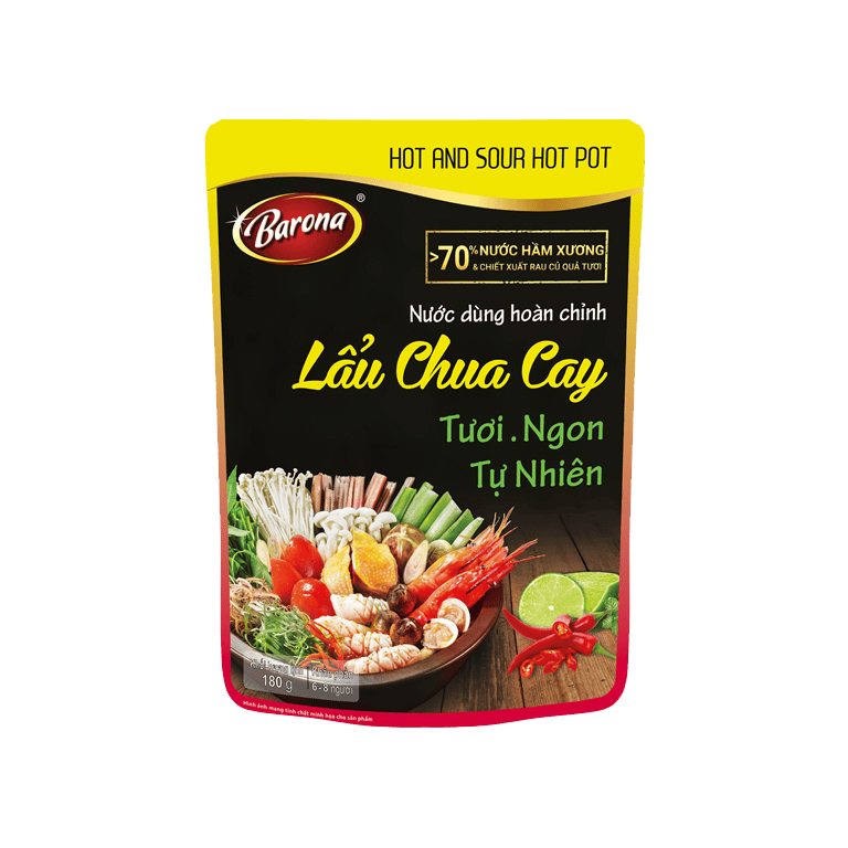 Barona spicy hotpot sauce 180g Fresh, Delicious, Natural with more than 70% ingredients Bone broth and fresh vegetable extracts are mixed with typical spices to create a spicy and sour hot pot flavor with a spicy, sour taste of the land of the Golden Temple. enthusiast. Extremely quick, convenient & hygienic, is a great choice for your family parties.