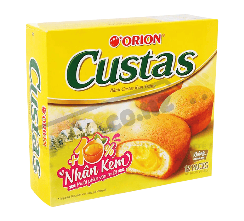 Bánh Custas Orion nhân kem trứng hộp 276g Thành phần Trứng (22%), bột mì, đường, dầu thực vật, chất béo thực vật, mạch nha, chất làm ẩm, bột sữa nguyên kem, chất nhũ hóa, bột dừa, bột kem sữa,…với lớp nhân trứng sữa dẻo và thơm lừng bên trong, thơm ngon được làm từ những nguyên liệu tự nhiên, an toàn cho sức khỏe.