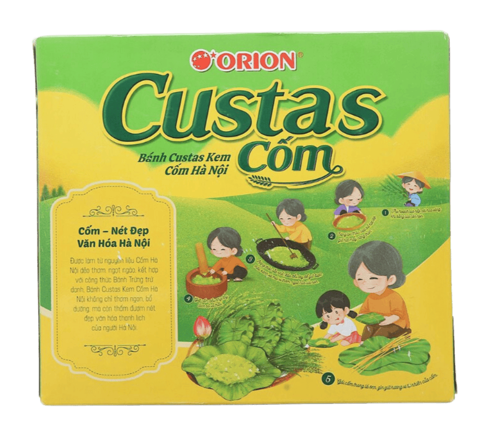 Bánh Custas Orion nhân kem cốm hộp 276g Thành phần Trứng (22%), bột mì, đường, dầu thực vật, chất béo thực vật, mạch nha, chất làm ẩm, bột sữa nguyên kem, chất nhũ hóa, bột dừa, bột kem sữa,…với hương vị cốm Hà Nội thơm ngon, lớp ngoài mềm xốp cùng nhân kem béo mịn, được làm từ những nguyên liệu tự nhiên, an toàn cho sức khỏe.