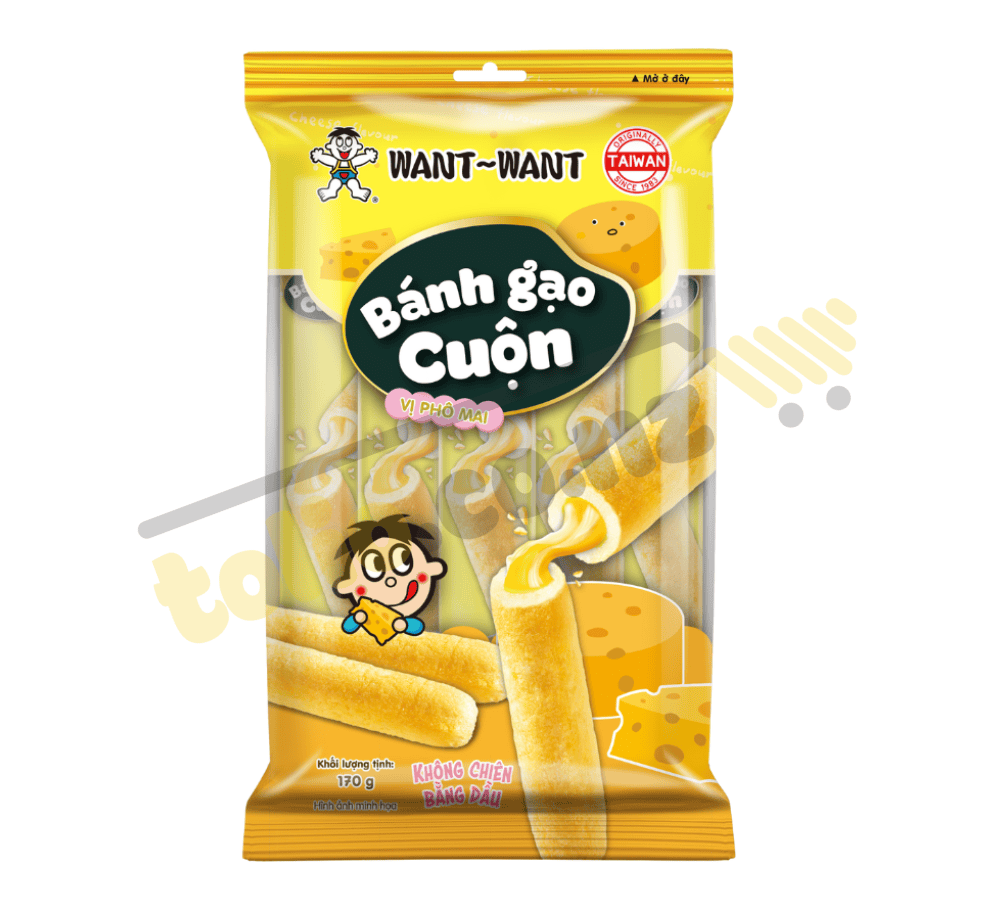 Bánh gạo cuộn Want Want vị phô mai 180g với lớp bánh ngoài giòn, mịn trên đầu lưỡi, sau đó lớp nhân mềm, mịn tan chảy mượt mà trong miệng, vị phô mai mặn thơm ngon, thích hợp dùng cho cả gia đình