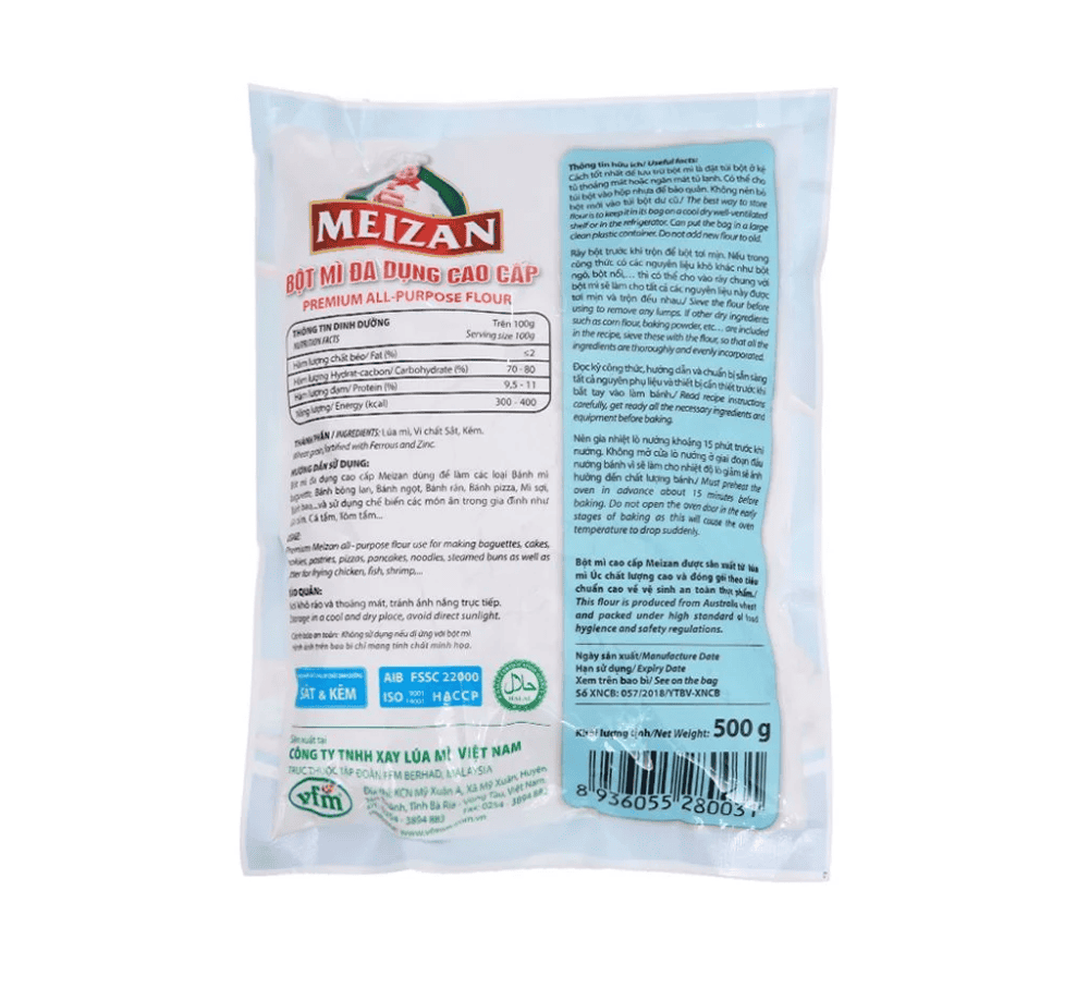 Bột mì Meizan 500g được làm từ lúa mì thiên nhiên, hàm lượng dinh dưỡng vừa đủ giúp cơ thể hấp thu tốt hơn. Bột mì Meizan được dùng làm nguyên liệu cho các loại bánh mì, bánh bông lan, bánh ngọt, bánh rán, bánh pizza, mì sợi, bánh bao… mang lại nhiều món bánh thơm ngon, hấp dẫn mà không mất quá nhiều thời gian chế biến. Không chỉ sử dụng làm bánh Bột mì đa dụng Meizan còn được dùng để chế biến các món ăn như gà tẩm, cá tẩm, tôm tẩm… giúp tăng thêm hương vị cho bữa cơm gia đình