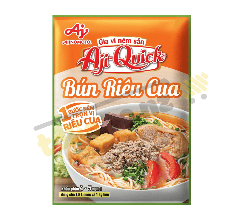 Gia vị nêm sẵn nấu bún riêu cua Aji-Quick 54g đã có đầy đủ những nguyên liệu cần thiết như đường, muối, bột mắm tôm, bột mắm ruốc, bột nước mắm, bột chiết xuất xương thịt hầm, hành, bột gia vị… và đặc biệt là bột cua đồng. Các nguyên liệu được tuyển chọn kỹ lưỡng từ nhà cung cấp uy tín, và phải trải qua quá trình kiểm định chất lượng nghiêm ngặt trước khi được đưa vào dây chuyền sản xuất.