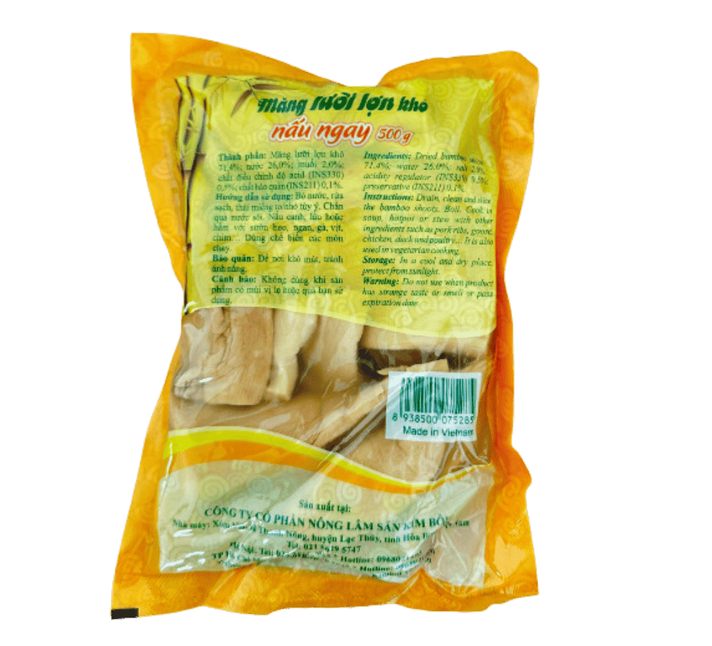 Măng lưỡi lợn khô nấu ngay Kim Bôi gói 500g được sản xuất bởi Công ty Cổ phần Nông sản Lâm sản Kim Bôi theo công nghệ hiện đại. Mọi quy trình từ khâu chọn nguyên liệu tới khâu chế biến và đóng gói đều tuân thủ nghiêm ngặt quy định về vệ sinh an toàn thực phẩm, đảm bảo mang đến tay người tiêu dùng sản phẩm sạch, chất lượng cao.