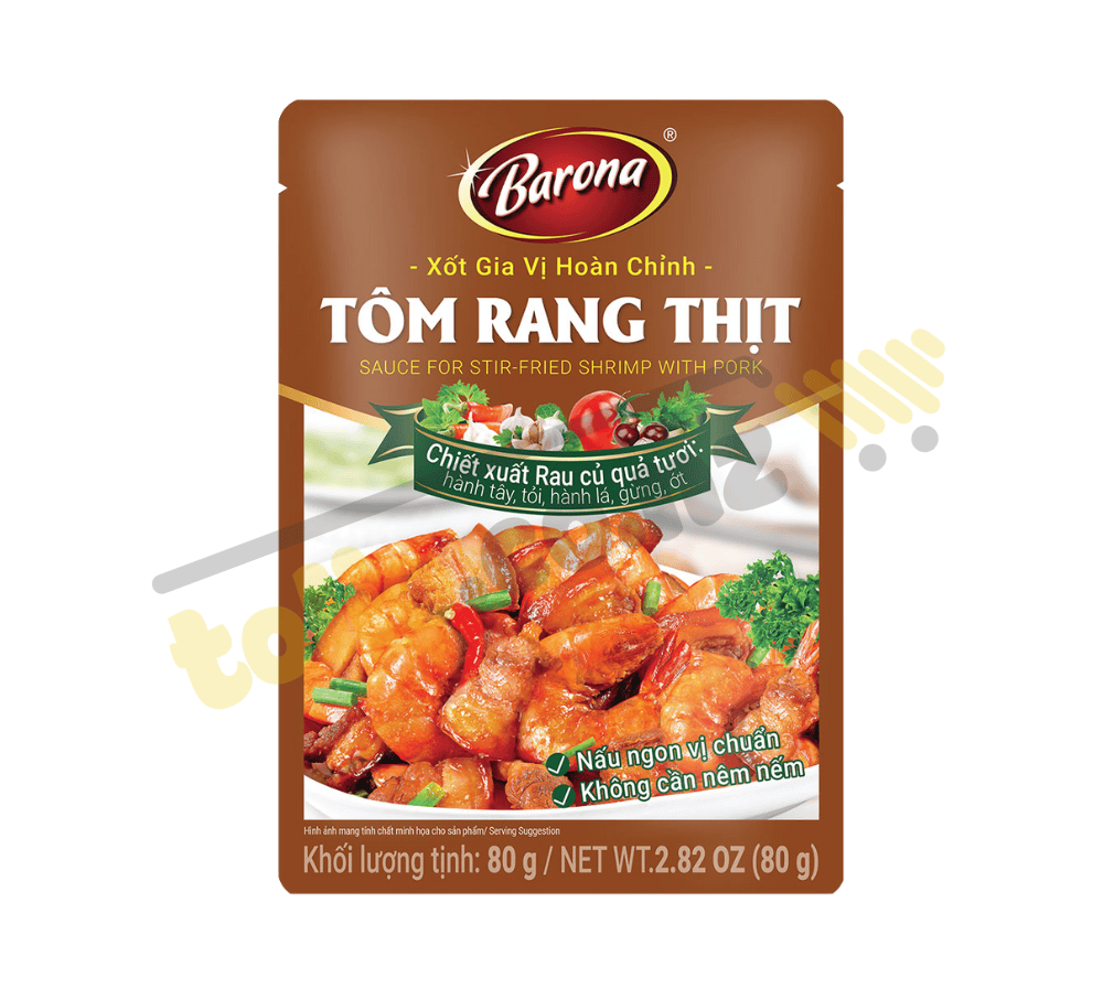 Xốt tôm rang thịt Barona 80g là loại gia vị nêm sẵn được chiết xuất từ rau củ quả tươi như hành tây, tỏi, gừng, ớt và các gia vị truyền thống, xốt tôm rang thịt Barona tạo nên món tôm rang thịt có hương vị tự nhiên, tươi ngon, khiến bữa ăn thêm hấp dẫn.