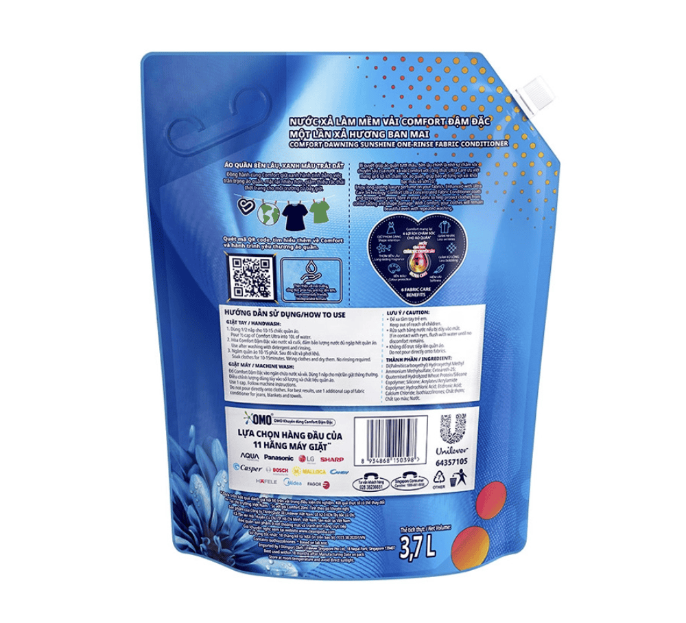 Nước xả vải Comfort hương ban mai túi 3.7L với hương nước hoa dễ chịu, giúp làm mềm vải hiệu quả, an toàn cho da và công thức xả đậm đặc tiết kiệm hơn rất nhiều. Nước xả mềm vải Comfort một lần xả hương ban mai túi 3.8 lít thơm lâu, mềm vải hiệu quả.