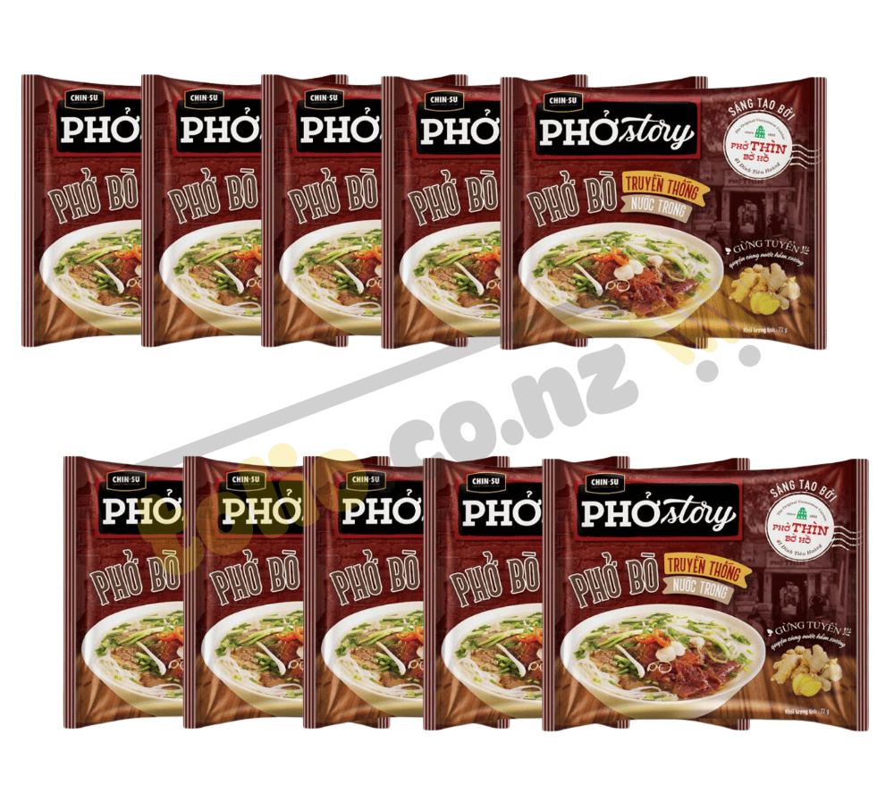 Set 10 gói phở Bò Chinsu Story 72g mang hương vị phở miền Nam, với nước dùng đậm đà từ xương, thơm mùi bò, mang lại món ngon đậm vị khó cưỡng.