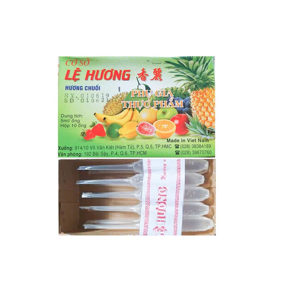 Dầu chuối Lệ Hương ống 5ml là loại đặc biệt thơm ngon, tự nhiên dùng trong ngành thực phẩm bánh kẹo… Dùng tạo hương cho các món chè, thạch găng, thách đen sương sáo.
