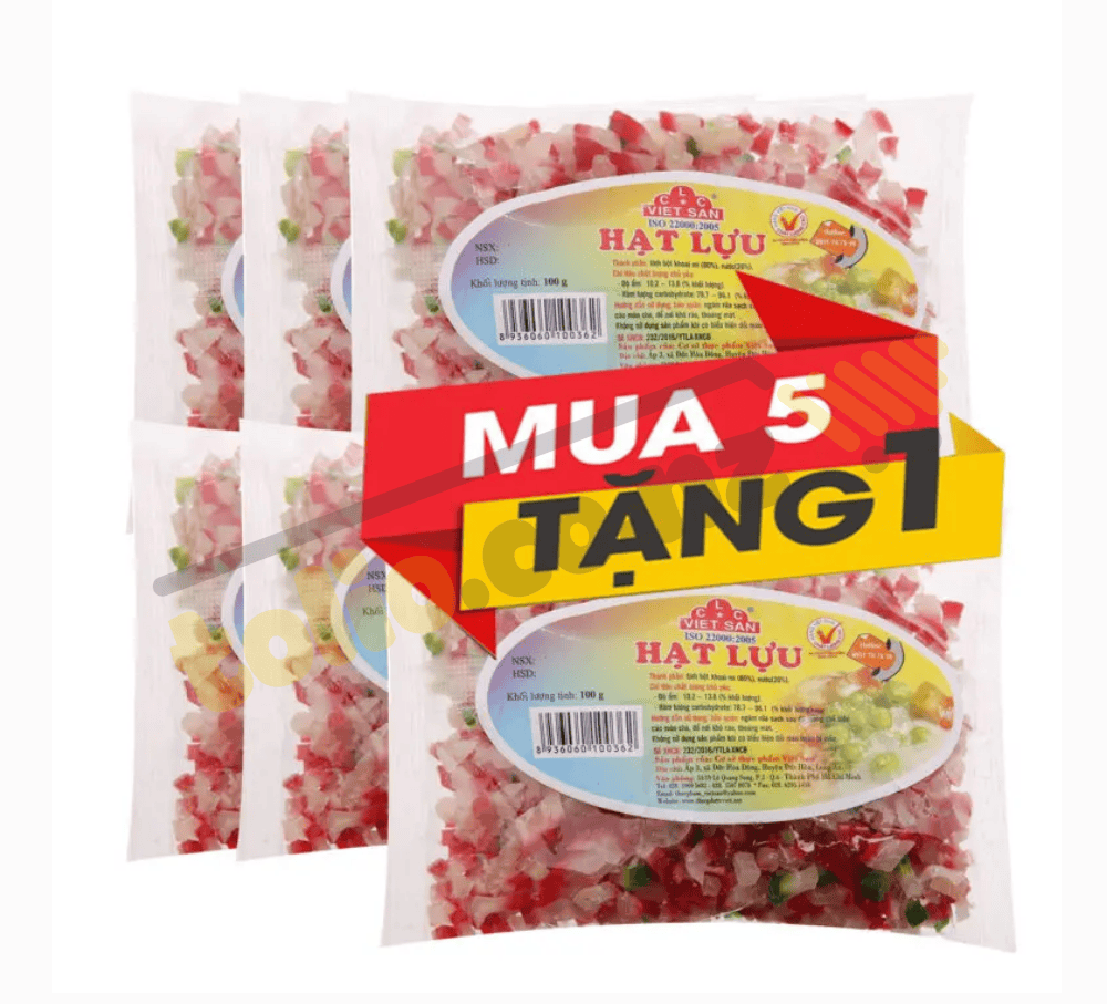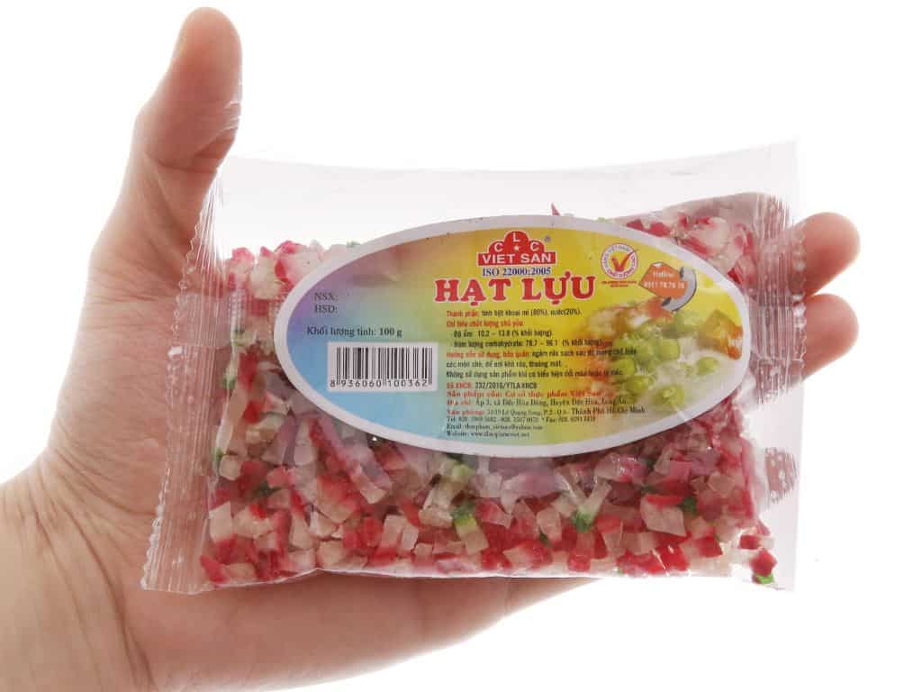 Hạt Lựu Việt San Gói 100g là sản phẩm được chế biến từ tinh bột mì và nước.