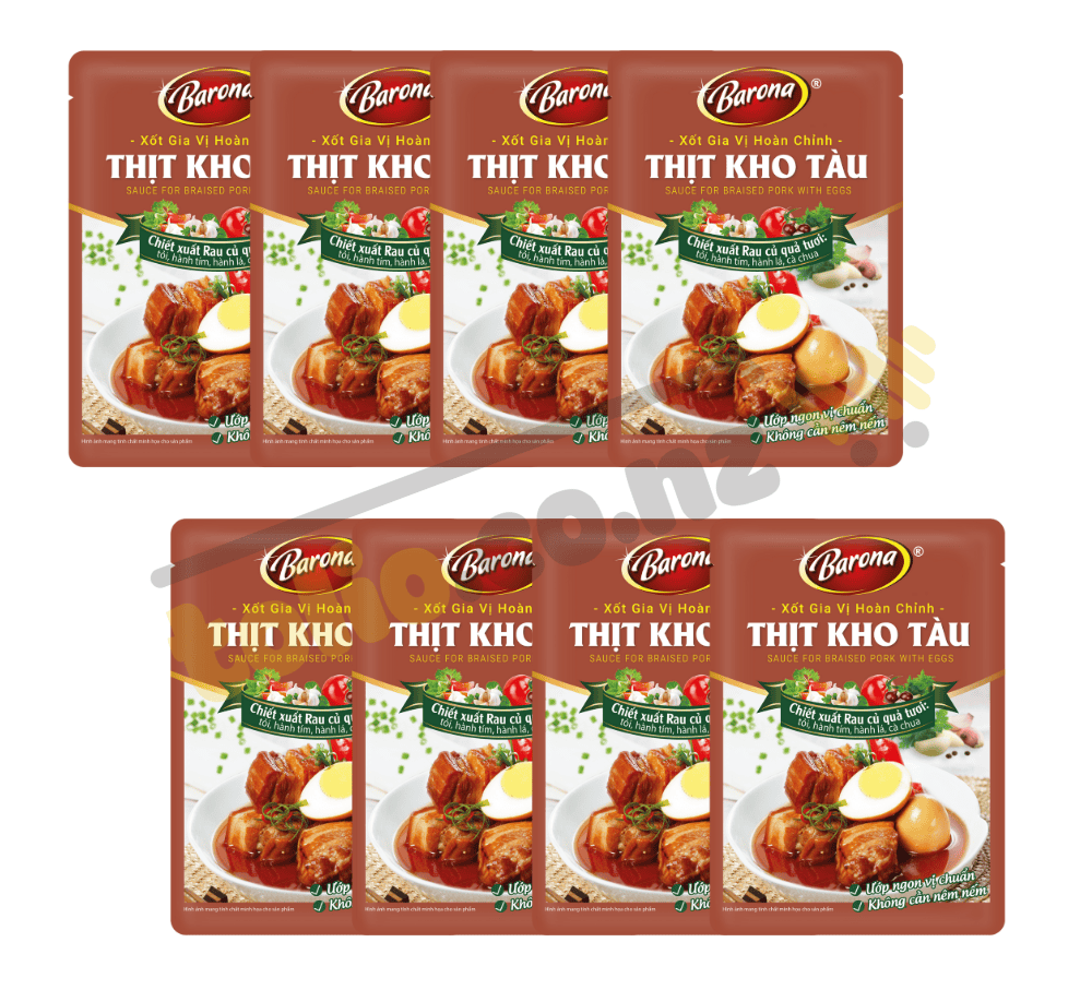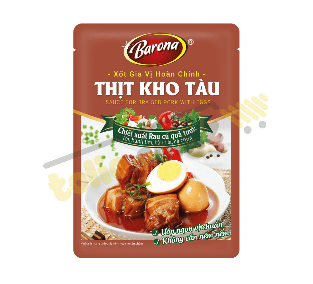 Xốt thịt kho Barona 80g là loại gia vị nêm sẵn đến từ thương hiệu Barona quen thuộc trong mỗi gia đình Việt Nam. Xốt gia vị hoàn chỉnh ướp thịt kho Barona gói 80g với dạng xốt đậm đặc chiết xuất từ rau củ quả tươi như hành lá, hành tím, cà chua…, mang đến món thịt kho thơm ngon, đậm đà hương vị nguyên bản, giúp các bà nội trợ tiết kiệm thời gian chế biến.