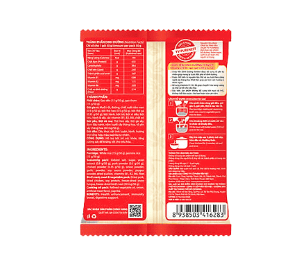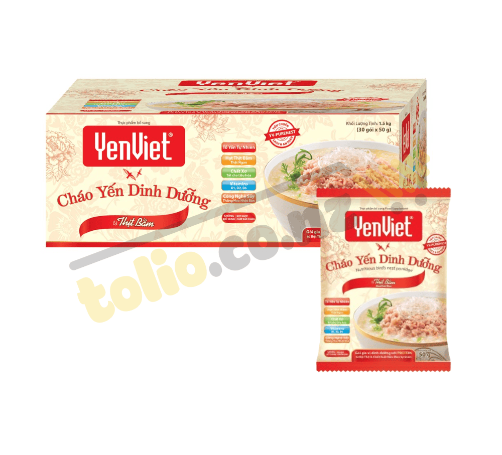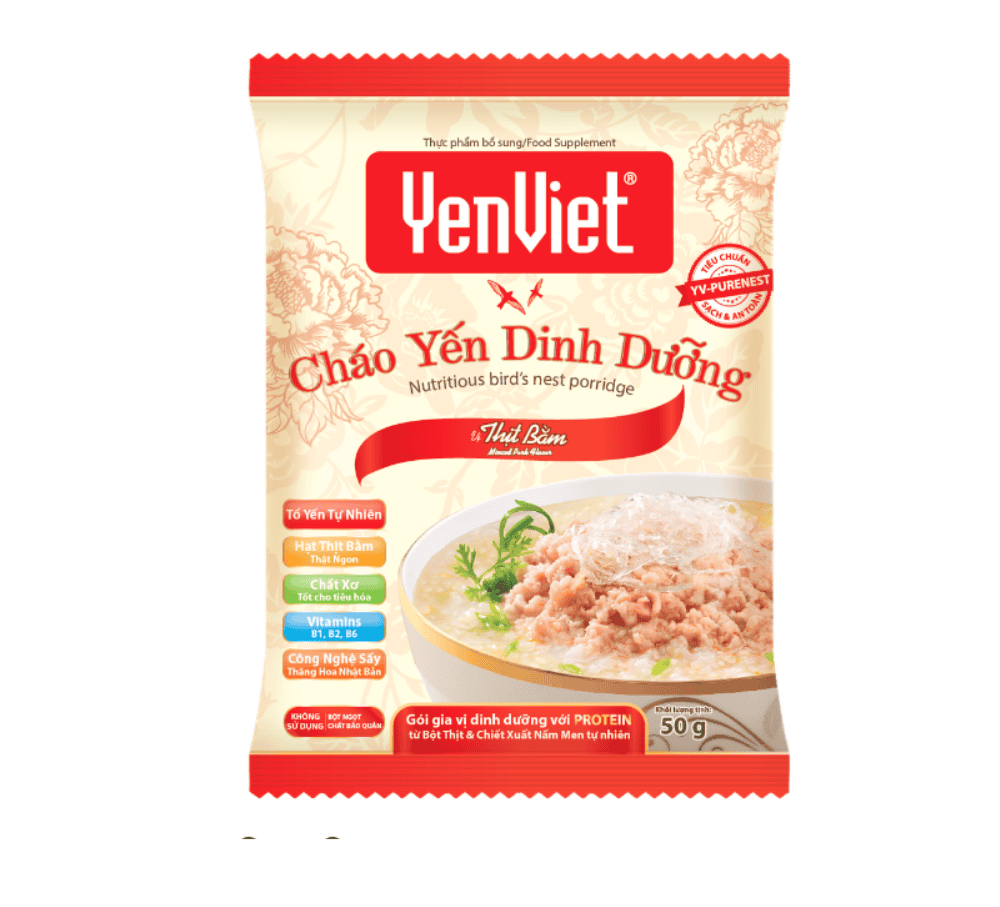 Cháo Yến dinh dưỡng YenViet vị thịt bằm 50g được bổ sung tổ yến thiên nhiên 100% giúp mang lại bước đột phá về dinh dưỡng. Không những bổ sung tổ yến mà còn được chế biến từ nguyên liệu thịt và rau tươi theo công nghệ sấy thăng hoa Nhật Bản giúp giữ trọn vẹn hương vị thơm ngon.