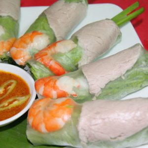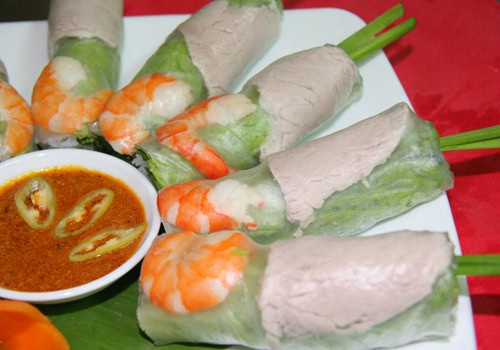 - Cho hải sản hoặc thịt đã trụng chín, bún và các loại rau trên bánh tráng