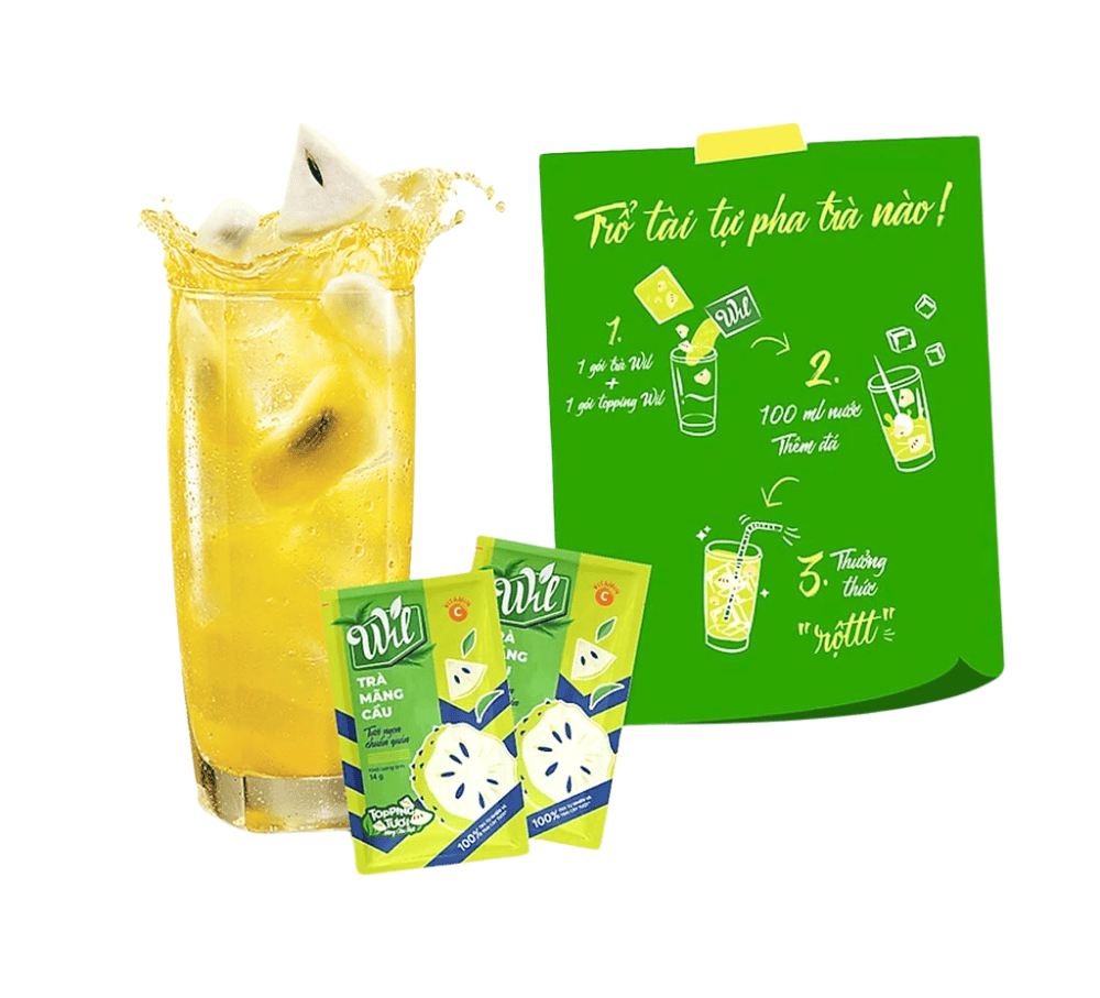- Cho gói trà mãng cầu Wil và topping mãng cầu tươi pha cùng với 100ml nước rồi khuấy đều