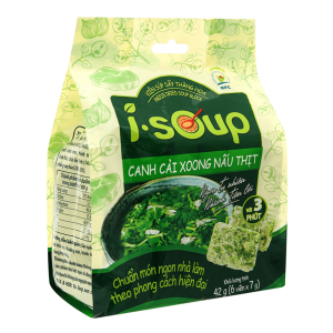 Viên canh ăn liền iSoup: cải xoong nấu thịt 7g được làm từ những nguyên liệu tự nhiên, đảm bảo an toàn như cải xoong, thịt heo và các gia vị, viên canh sấy thăng hoa rất tiện lợi sử dụng.