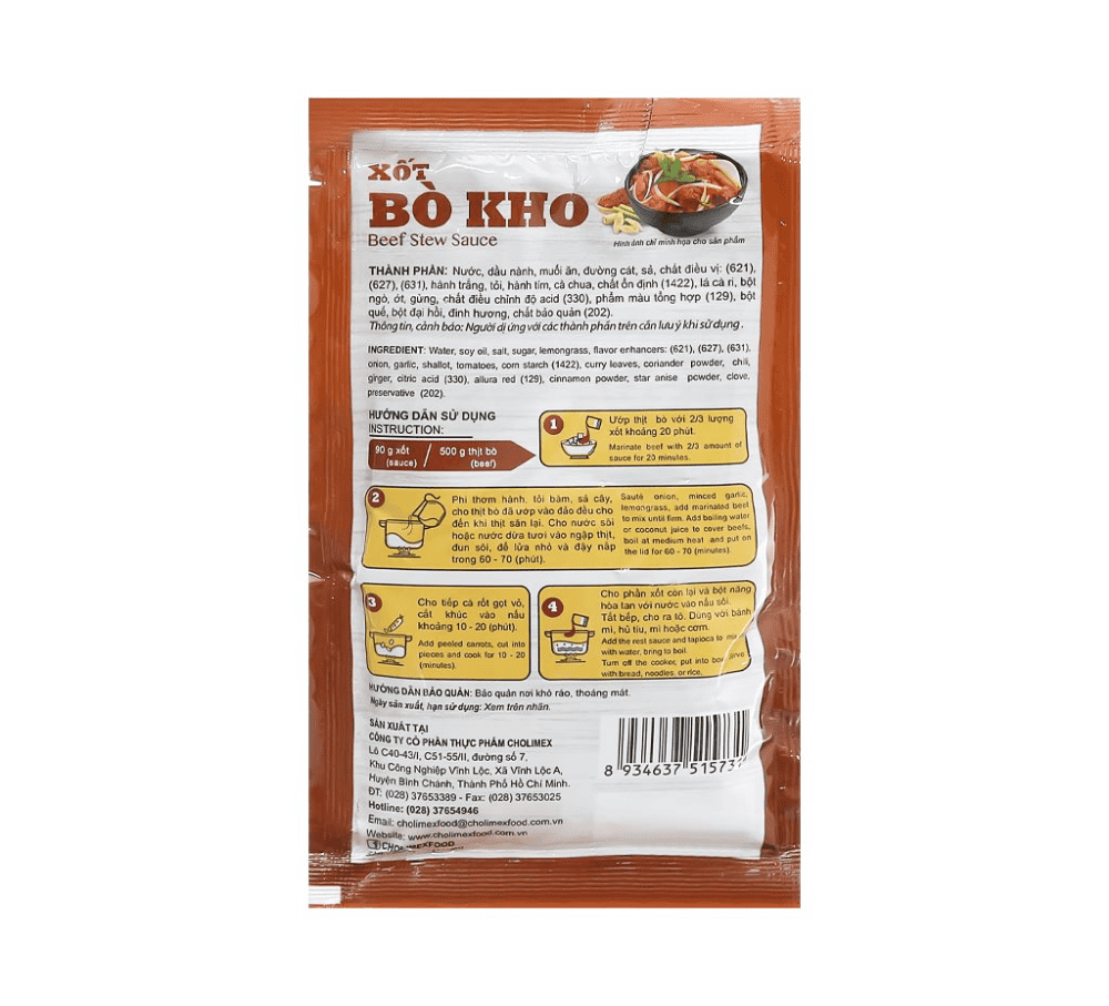 Xốt bò kho Cholimex gói 90g với công nghệ sản xuất hiện đại, tích hợp nhiều gia vị đặc trưng chỉ trong 1 gói xốt, giúp bạn dễ dàng chế biến món bò kho chuẩn vị, đậm đà mà không phải mất quá nhiều thời gian.