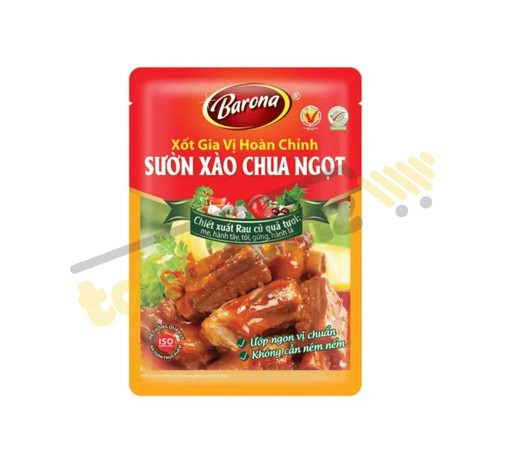 Xốt sườn xào chua ngọt Barona gói 80g là loại gia vị nêm sẵn được chiết xuất từ rau củ quả tươi như gừng, hành lá, tỏi, ớt kết hợp với các loại gia vị khác, đến từ thương hiệu Barona. Xốt gia vị hoàn chỉnh sườn xào chua ngọt Barona gói 80g mang đến hương vị món xào chua chua ngọt ngọt, không cần thêm bất kì nguyên liệu nào.