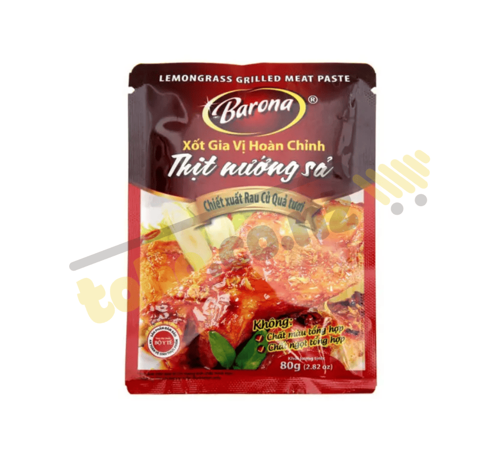 Gia vị nêm sẵn Barona được sản xuất trên dây chuyền khép kín, đáp ứng tiêu chuẩn chất lượng cao. Xốt gia vị hoàn chỉnh thịt nướng sả Barona gói 80g là loại gia vị nêm sẵn chiết xuất từ rau củ tươi mang đến món thịt nướng sả thơm ngon, cho sườn mềm và có màu vàng cánh gián thơm ngon và hấp dẫn.